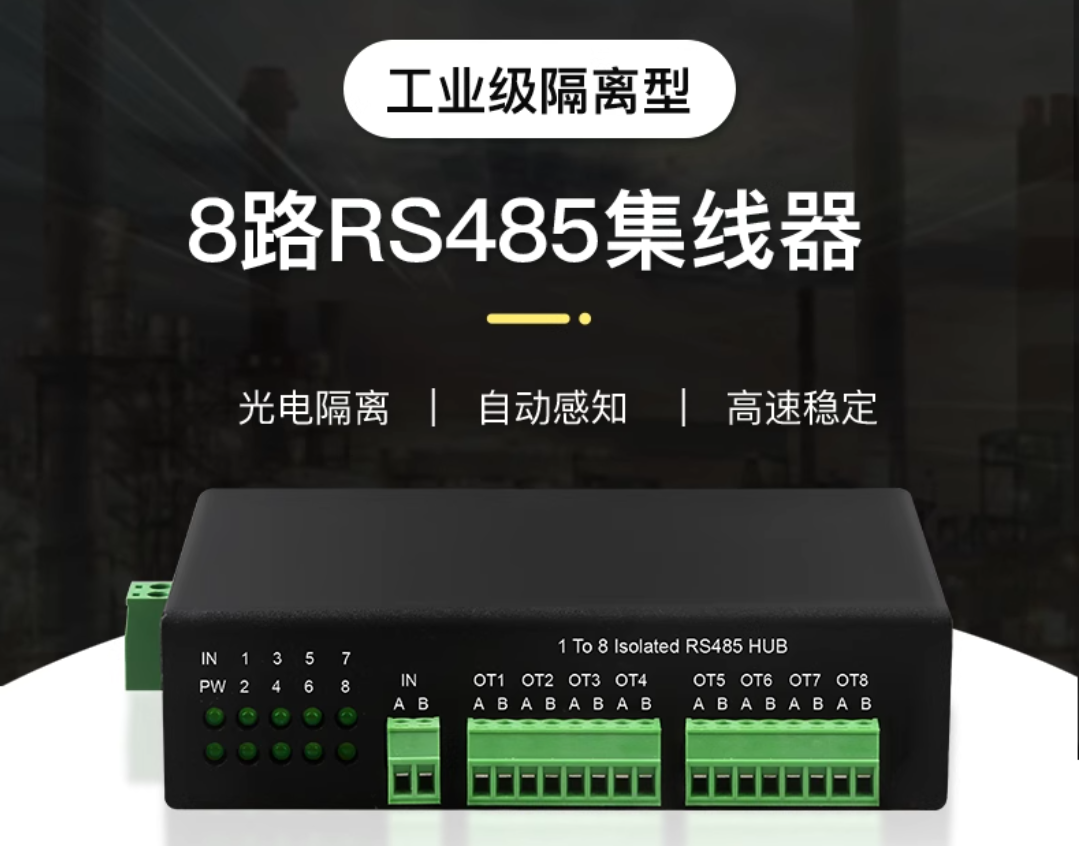 工业级8路RS485光电隔离集线器,工业自动化·楼宇自控·电力监控,支持光电隔离/自动感知/高速稳定传输。解决多设备组网干扰、雷击损坏问题,适用于严苛工业环境组网扩展。