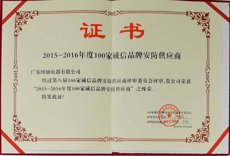 广东纽脉电器有限公评为全国100家安防品牌供应商证书